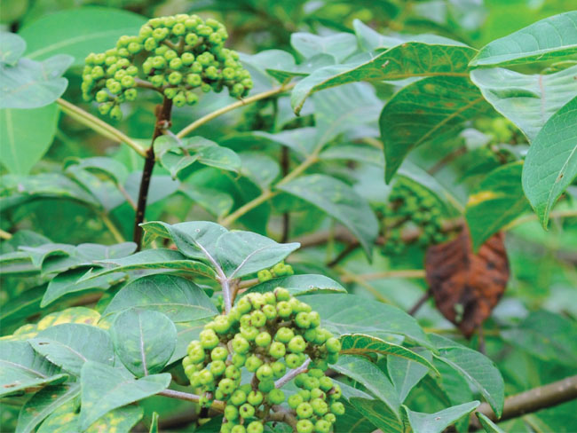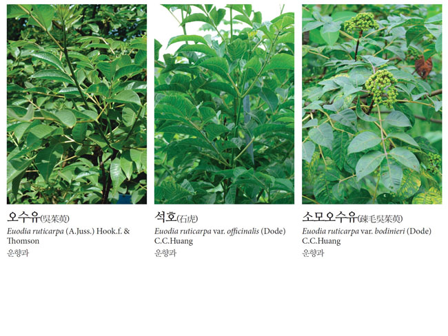 학명 | Evodia rutaecarpa Bentham (오수유), Evodia rutaecarpa Bentham var. officinalis Huang (석호), Evodia rutaecarpa Bentham var. bodinieri Huang (소모오수유) |
