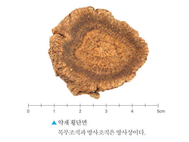 | 기원 | 목향(木香) Aucklandia lappa Decne (국화과 Compositae)의 뿌리로 거친 껍질을 제거한 것 |