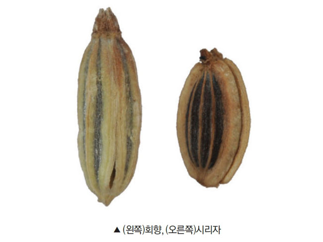 | 이명 | 소회향(小茴香), 곡회향(谷茴香), 향자(香子), 소향(小香), 토회향(土茴香) |