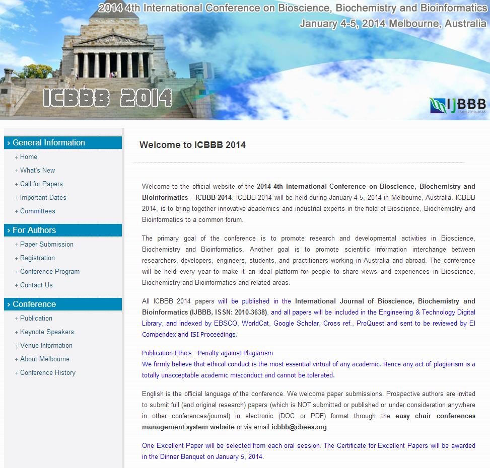 ICBBB 2014 will be published in the Journal of Bioscience, Biochemistry and Bioinformatics (IJBBB, ISSN: 2010-3638), and indexed by EBSCO, WorldCat, Google Scholar, Cross ref., ProQuest and sent to be reviewed by EI Compendex and ISI Proceedings.