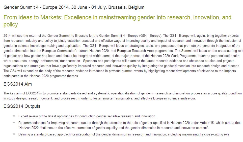 Gender Summit 4 - Europe 2014, From Ideas to Markets: Excellence in mainstreaming gender into research, innovation, and policy