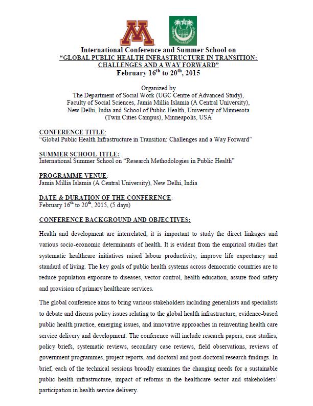 주최 The Department of Social Work (UGC Centre of Advanced Study), Faculty of Social Sciences, Jamia Millia Islamia (A Central University), New Delhi, India and School of Public Health, University of Minnesota (Twin Cities Campus), Minneapolis, USA
