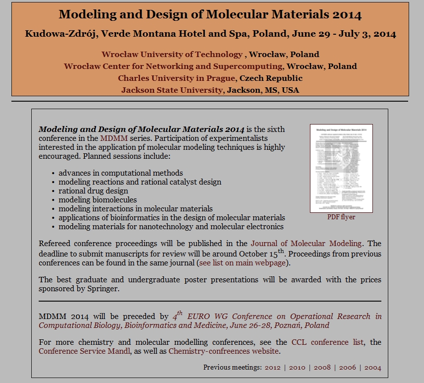 Modeling and Design of Molecular Materials 2014 is the sixth conference in the MDMM series. Participation of experimentalists interested in the application pf molecular modeling techniques is highly encouraged