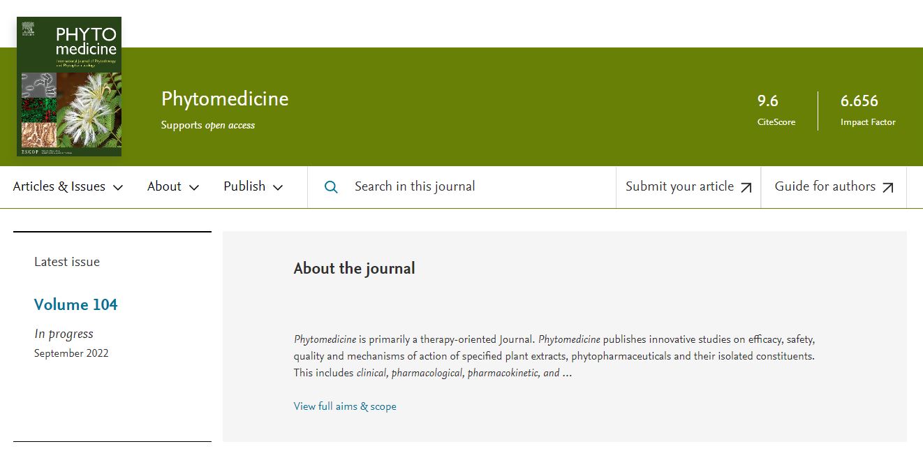 Phytomedicine is primarily a therapy-oriented Journal. Phytomedicine publishes innovative studies on efficacy, safety, quality and mechanisms of action of specified plant extracts, phytopharmaceuticals and their isolated constituents. This includes clinical, pharmacological, pharmacokinetic, and toxicological studies of specified herbal medicinal products, herbal preparations and purified compounds which have a defined and consistent quality assuring reproducible pharmacological activity.