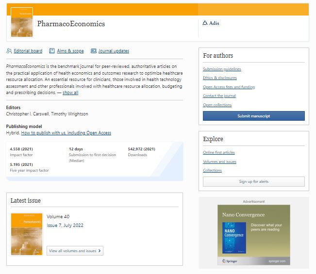As a hybrid journal, PharmacoEconomics does not charge authors to publish using the traditional subscription-based publishing route, but does offer the option to publish accepted articles open access if authors so wish or if their funders require. This is achieved via the Springer Open Choice™ initiative. More information about this optional route to open access and the associated article processing charge can be found by clicking on the ‘How to publish with us, including Open Access’ link below.